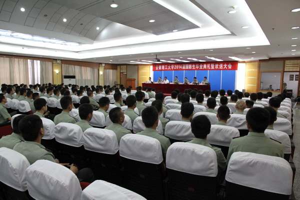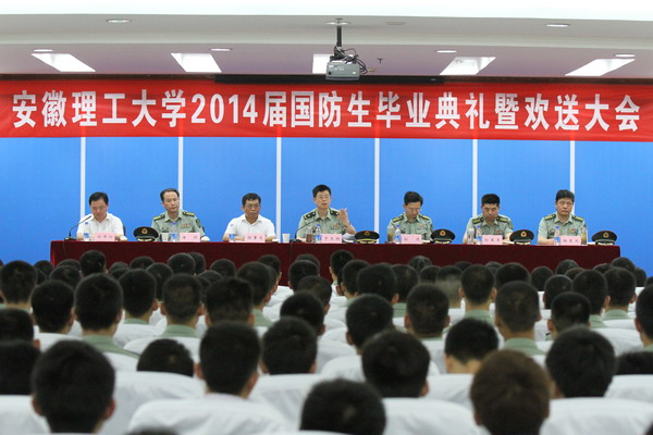 6月24日,安徽理工大学2014届国防生毕业典礼暨欢送大会在9楼报告厅举行。安徽省军区司令员于天明出席大会并讲话。安徽理工大学党委书记颜事龙,安徽省军区政治部主任孙进、副参谋长孙亚军、后勤部副部长杨东风,淮南军分区政委潘晓参加了会议。毕业典礼由安徽理工大学副校长刘泽功主持。