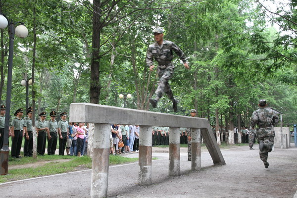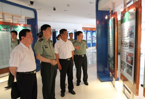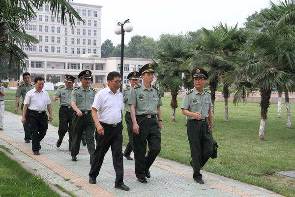 期间,于天明司令员一行与国防生合影留念,并在校领导颜事龙、刘泽功的陪同下参观了校园、校史馆,还实地观看了国防生的训练情况。