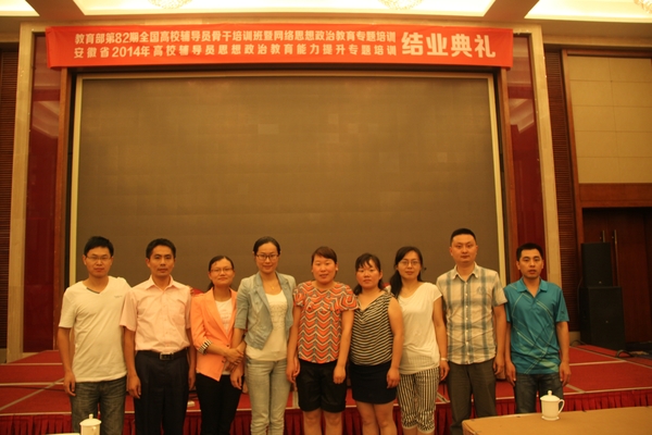 6月25日至27日,由中共安徽省委教育工委、教育部高校辅导员培训和研修基地(安徽师范大学)举办的安徽省2014年高校辅导员思想政治教育能力提升专题培训班在芜湖举行。我校9名学员和来自全省其他42所高校的210名学员共同参加了此次培训。