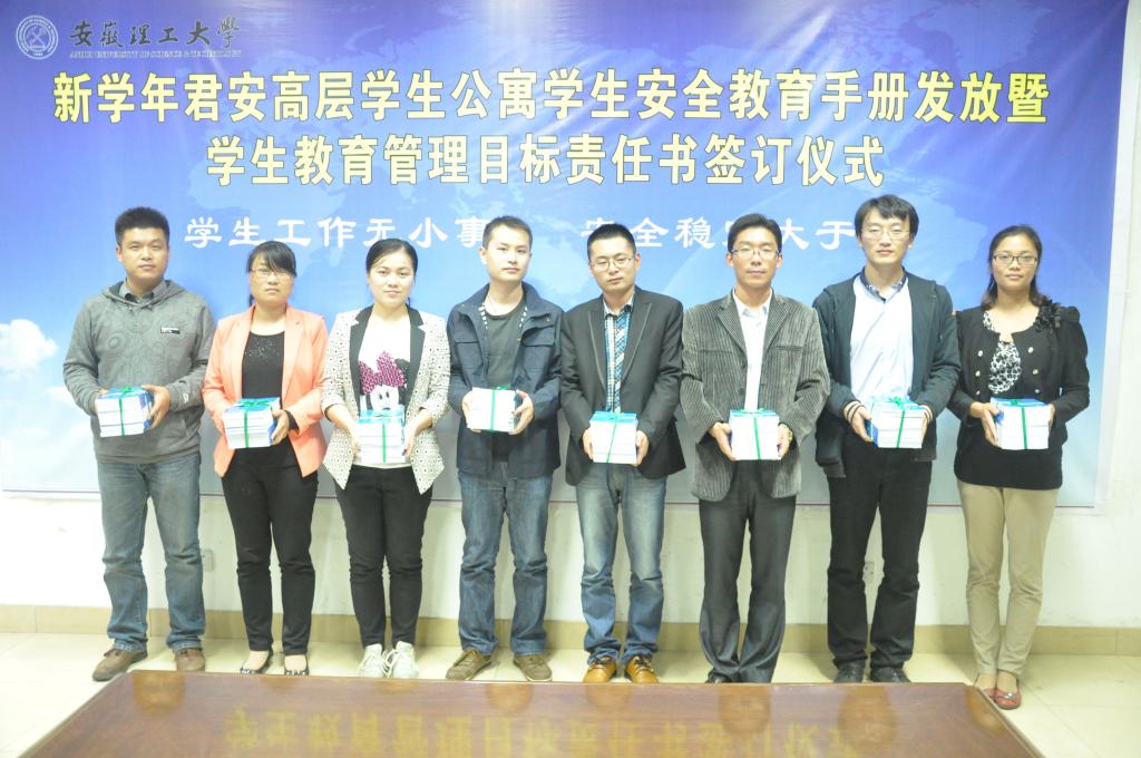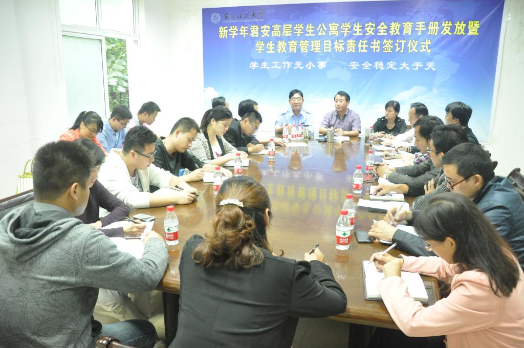 从2002年学校和嘉禾物业公司签订学生入住相关协议以来,君安高层公寓平安运行近15个年头,2万6千多名学生从这里圆满毕业走向社会。长期以来学校党政和嘉禾物业公司高度重视君安公寓学生教育和管理工作,通过多年摸索,逐步形成了一套行之有效的管理体系和管理模式,确保了君安公寓十几年平安运行。目前,入住学生近5300人。9月18日下午,学校在大学生素质教育中心举行了新学年君安高层学生公寓学生安全教育手册发放暨学生教育管理目标责任书签订仪式,就进一步加强高层学生公寓住宿学生安全教育,严格安全管理各项规定,确保高层学生公寓安全稳定工作做出部署。保卫处处长李明、君安高层公寓嘉禾物业总经理王萍、学生处处长田中良、副处长黄晟、涂有胜和全体2012级君安高层学生公寓辅导员参加了会议。