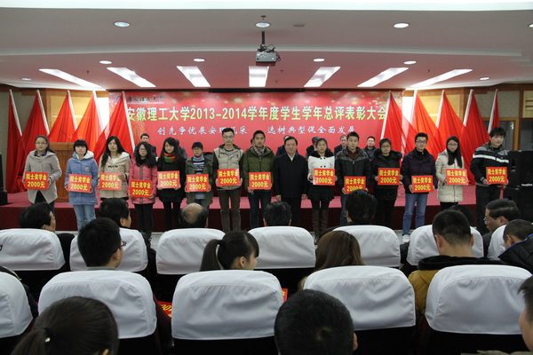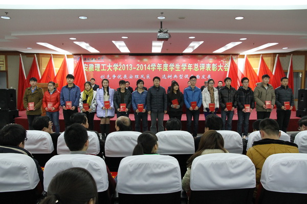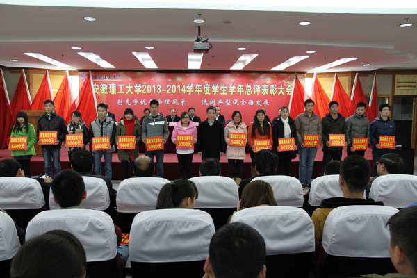 表彰大会在庄严的国歌声中拉开帷幕。校长郭永存发表了热情洋溢的讲话,向取得优异成绩的同学们表示诚挚祝福,向精心培育学生的老师们致以衷心感谢,向长期关心和支持学校发展的社会各界致以崇高的敬意!近年来,在同学和教职工的共同努力下,学校各项事业快速发展,成功跨入省部共建高校行列,进入安徽省地方特色高水平大学建设序列,学校的人才培养、科学研究、服务社会及文化传承等方面成果丰硕,新校区建设工程全面开工,预计明年一个功能齐全、环境优美的现代化校园将全面建成。郭永存勉励同学们在荣誉面前不自满、不松懈,好好把握住当前的黄金学习机会,正确对待生活中遇到的各种压力,化压力为动力,保持定力、持续给力,站在新的起点上,用拼搏续写辉煌,不断取得新的成绩。