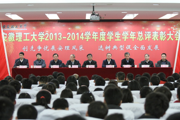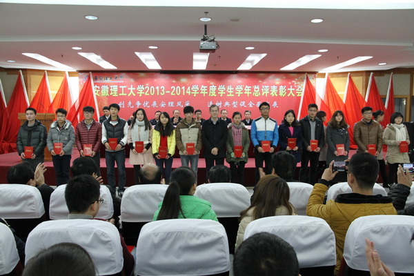 12月18日下午,2013-2014学年学生总评表彰大会在九楼报告厅隆重举行。会场气氛热烈、掌声雷动。校党委书记颜事龙,校长郭永存,校领导叶醒狮、王洪、刘泽功、王其东、孟祥瑞、周峰等出席表彰大会,并分别为获奖的先进集体和个人颁奖。