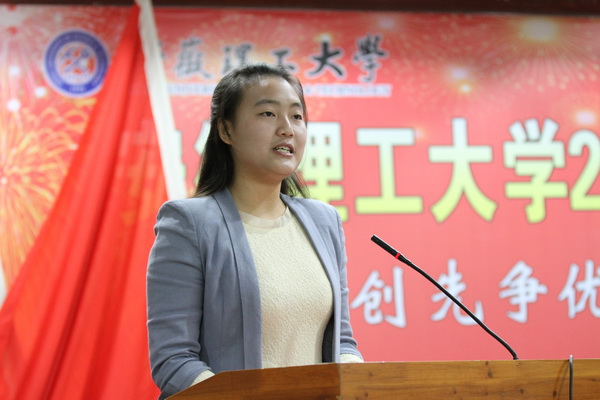 三好学生代表外国语学院李丹妮同学、国家励志奖学金获得者代表机械学院吴超同学、优秀学生干部代表化工学院薛梦瑶同学、先进集体代表材料学院于冲同学分别代表获奖集体和个人发言,分享了自己在追逐梦想道路上的奋斗历程,感谢学校和老师的辛勤培育,并表示将戒骄戒躁,更加严格地要求自己,不辜负老师的殷切期盼,再接再厉,不断取得新的成绩。