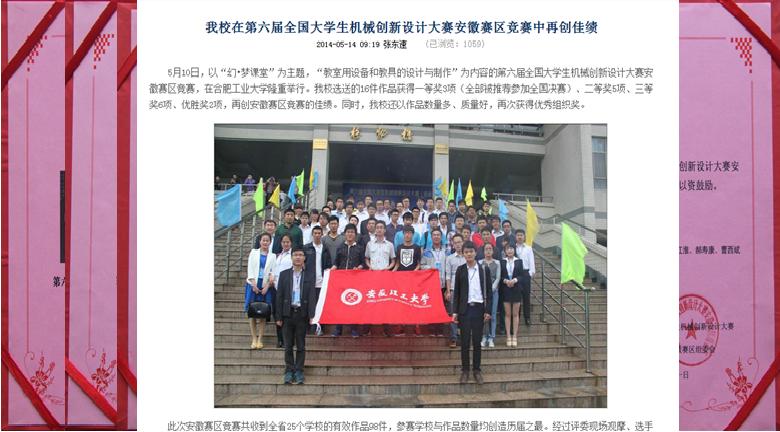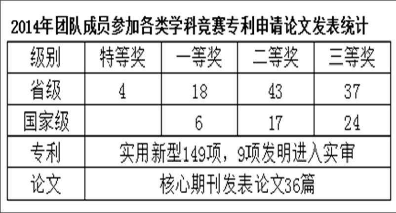 通过组建科技创新团队,培养了学生的动手能力、实践能力、团队协作能力。2014年学院组建的28支创新实践团队以受资助项目为依托,参加了各级各类学科竞赛,并申请专利发表论文,取得了丰富的实践成果。在全国大学生节能减排与社会实践竞赛、“飞思卡尔”智能汽车竞赛、全国大学生过程装备实践与创新大赛、全国三维数字化创新设计大赛、全国信息技术应用水平大赛等大赛中斩获大奖,特别是在全国大学生机械创新设计大赛获得全国一等奖实现了历史性突破;同时以第一作者申请专利多项,发表学术论文多篇,成果丰硕。