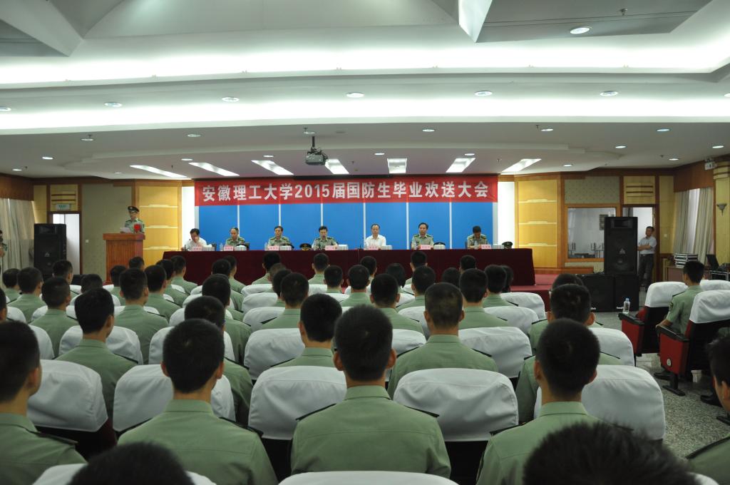 6月17日下午,安徽理工大学2015届国防生毕业欢送大会在9楼报告厅举行。安徽省军区副政委孙进少将、安徽理工大学校长郭永存出席大会并讲话。安徽省军区政治部副主任葛茯苓、后勤部副部长陈琮琪,淮南军分区司令员刘礼叶、政委幸迎春参加了会议。毕业欢送大会由安徽理工大学副校长刘泽功主持。