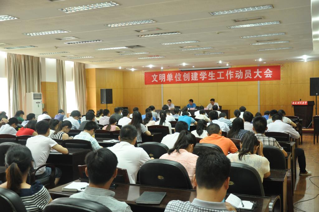 省教育系统文明单位是省教育系统精神文明建设综合考核的最高荣誉,是学校各项工作取得显著成绩的重要标志,是衡量学校办学水平的重要标准。我校2013年申报并获批省教育系统文明单位的立项建设单位,经过两年建设,我校将于6月29号(下周一)下午迎来教育厅专家组对我校教育系统文明单位创建的验收。这次检查时间紧,任务重,是对我们办学水平的一次全方位的检验,创建结果将影响到学校的社会声誉、社会形象和社会地位,也会影响到生源质量、毕业生的就业,直接关系到广大师生的切身利益,关系到学校的生存和发展。会议要求各学院和相关单位一定要高度重视,积极行动起来,将思想统一到教育厅关于文明单位创建工作的要求及学校做好创建工作的总体思路上来,进一步加大宣传力度,细化工作任务,将责任明确到人,做到人人知晓创建、人人参与创建,通过年级大会、主题班会,教育学生自觉成为学校规章制度的履行者,模范执行者,自觉遵守校规校纪,端正学习态度,杜绝迟到早退和旷课现象,培养良好的学习风气。讲究礼貌待人、文明用语,搞好个人和环境卫生,教室、宿舍、公共场所、以干净整洁的环境和良好的个人形象迎接专家组的到来,及时发现带有苗头性、倾向性的问题,找出存在的薄弱环节,采取针对性的措施,辅导员要全部深入课堂、宿舍,了解掌握并及时处理创建过程中学生有关情况与问题。以最饱满的热情、最细致的工作、最严明的纪律、最良好的氛围、最周到的服务,迎接专家组的到来;以优秀成绩,为学校的美好明天做出应有的贡献!