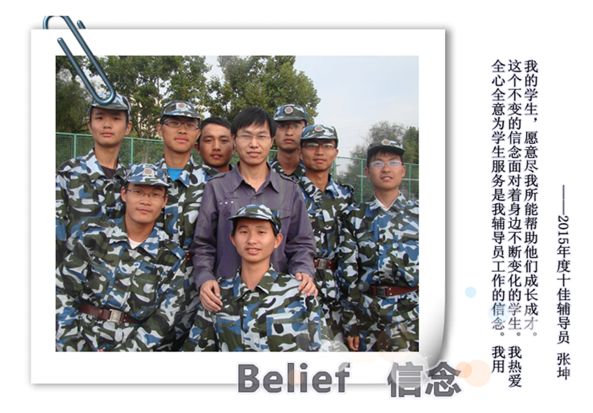 在辅导员工作岗位上的三年里,我用“让每个人都成为最好的自己”作为我的工作信念。我用心工作,适应着、学习着、吸取着、快乐着,不断感悟教育的真谛。倾听学生的心声,了解学生的想法,帮助学生解决困难,培养他们成才是辅导员的使命。脚下的路正长,我会和我的学生一起成长。踏实前进,超越自我。在不断学习和勤奋工作中,将自己练成一名稳中求变、变中求新的“智慧型”辅导员。