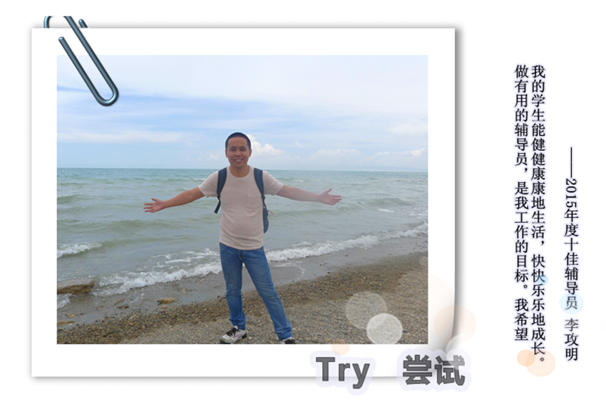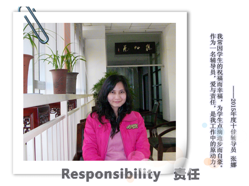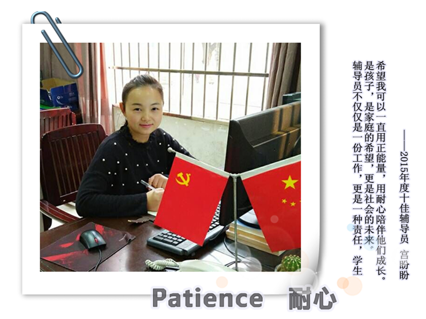 从工作的第一天起,我就告诉自己,辅导员不仅仅是一份工作,更是一种责任,学生是孩子,是家庭的希望,更是社会的未来。我深深地感受到自己肩上沉甸甸的责任和使命。四年里,我不断告诉学生们困难时要坚持,用耐心一定会成功;我也不断告诉自己困难时要坚持,小树苗有一天定会长成参天大树。希望我可以一直用正能量,用耐心陪伴他们成长。