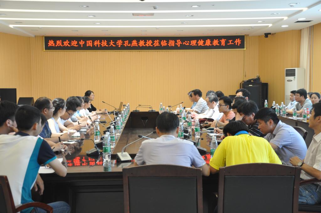 5月31日下午,中国科学技术大学教授、博士生导师、安徽省心理健康教育学会会长、安徽省大学生心理健康教育研究分会会长孔燕教授做客我校百川大讲堂,在舜耕苑二楼会议室为全校学生工作干部作了题为《学生心理成长的积极路径》的心理健康教育报告。报告会由学生处处长田中良主持,副校长吴照明和相关职能部门负责人、各学院副书记、全体专兼职辅导员、及部分班主任、心理委员100余人聆听了报告。