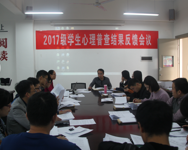 10月26日下午,2017级学生心理普查结果反馈会在学生处会议室召开会议。学生处副处长涂有胜主持会议,心理健康教育中心专职教师以及各学院新生辅导员参加了会议。