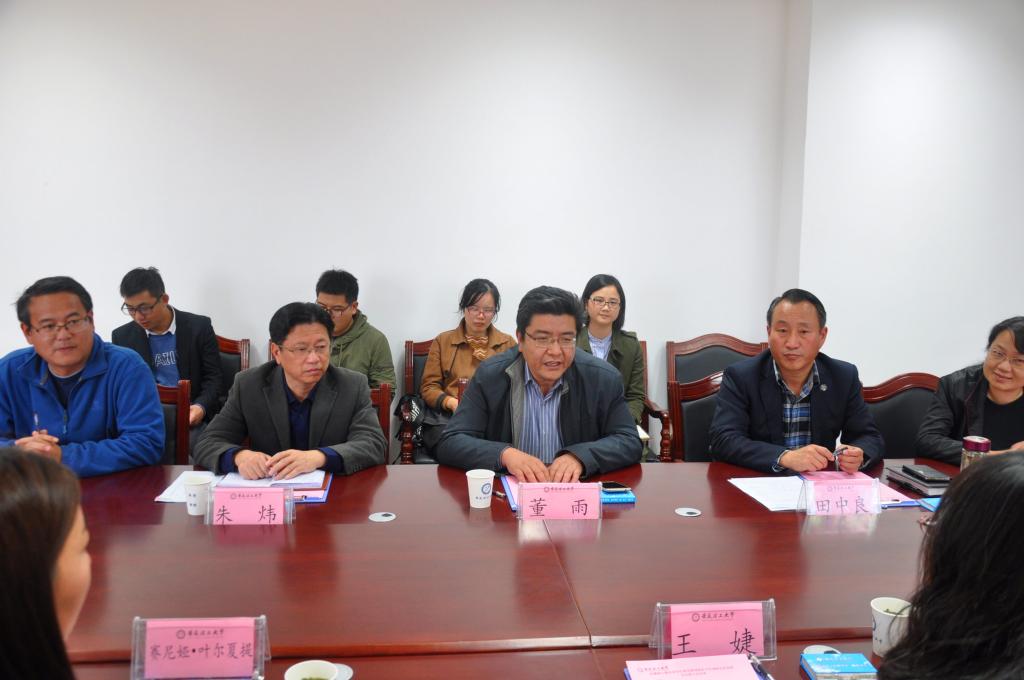 董雨对调研组一行的到来表示热烈欢迎,感谢调研组、新疆教育厅及安徽省教育厅对我校新疆籍少数民族学生教育管理服务工作的大力支持,并向调研组介绍了我校新疆籍少数民族学生的基本情况和新疆内派教师到校后学习、生活、工作开展情况。党委学工部部长田中良具体介绍了学校在少数民族学生教育管理服务的相关举措。王婕对我校利用学科专业优势,结合学校实际,以高度的责任意识、有力的工作举措,教育引导新疆少数民族学生健康成长成才的做法给予了充分肯定,并就内派教师管理使用、如何进一步加强新疆少数民族学生教育管理服务工作作了具体指导。