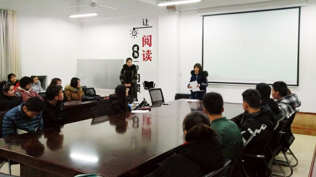 会上美合日妮萨·巴图尔、冉国锋、迪力胡马尔·麦麦提三位同学分别从日常学习、考证考研、活动参加等方面和18级同学做经验交流。赵丽凤、阿娜尔古丽两位内派教师联系刚刚过去的12·9运动纪念日和12·13国家公祭日向同学们开展爱国主义教育,引导同学们不忘初心,勤奋学习,报效祖国;针对即将到来的四六级考试、期末考试,内派老师鼓励大家沉着应考,诚信应试,坚决不能违反校规校纪;在安全教育中,内派老师提醒同学注意寝室用电安全、出行安全。