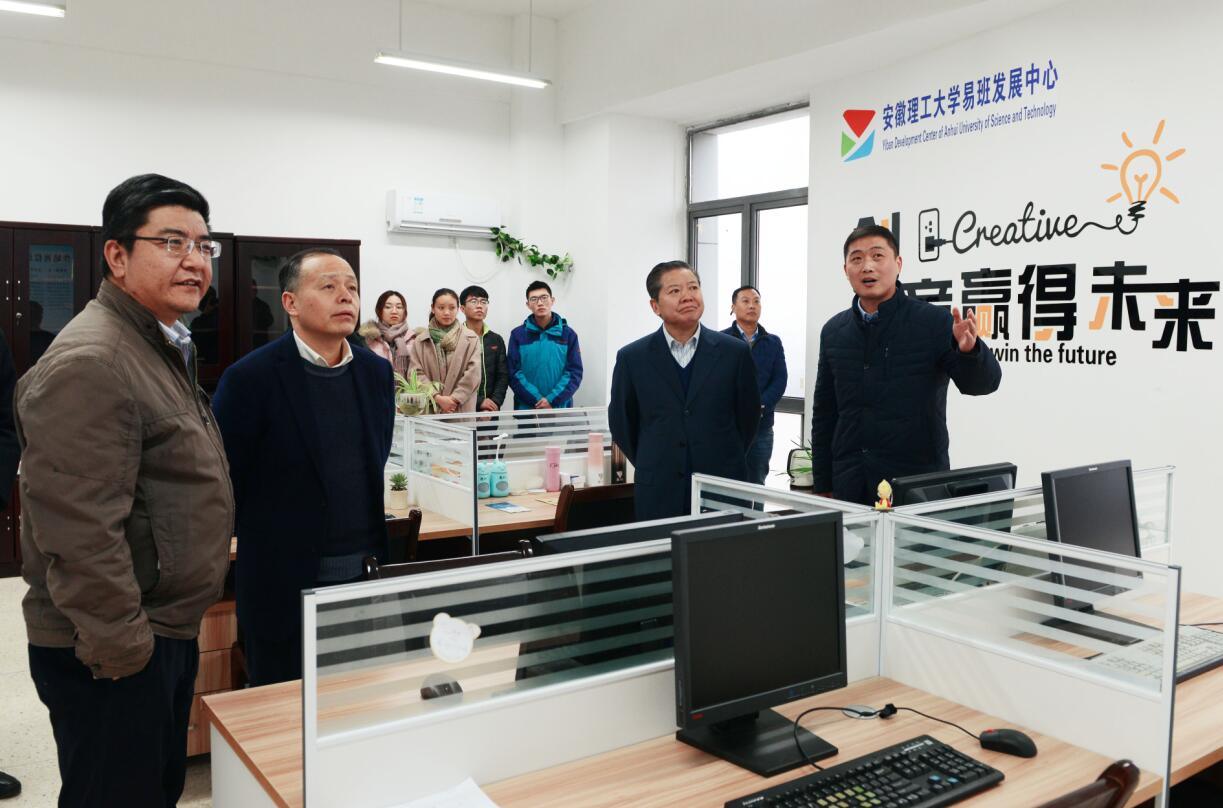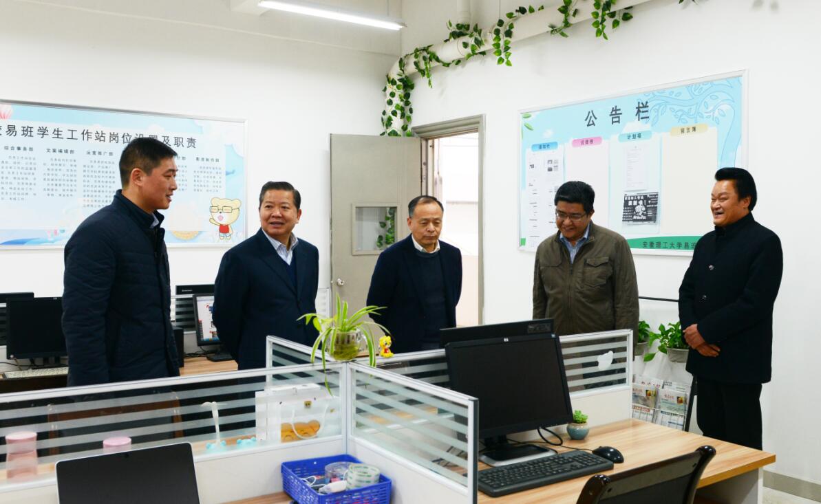 校领导现场查看了易班学生工作站建设情况,听取学生处工作人员汇报,观看学校易班PC端、APP端操作演示,了解易班的智能硬件及周边文化衍生品。