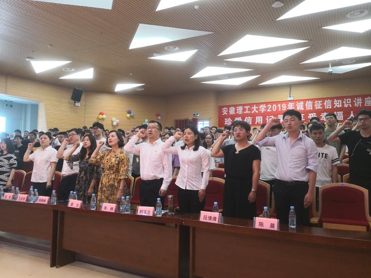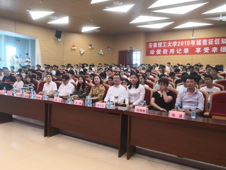 5月24日下午,由学生处与中国人民银行淮南市中心支行、淮南市发改委、中国工商银行淮南分行共同举办的校2019年诚信征信知识讲座在钻石剧场举行。