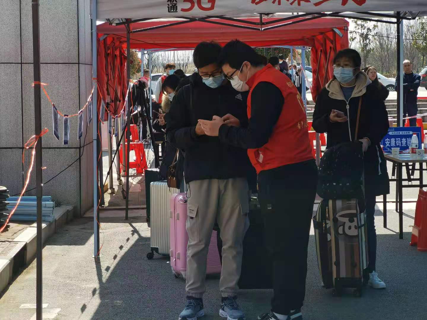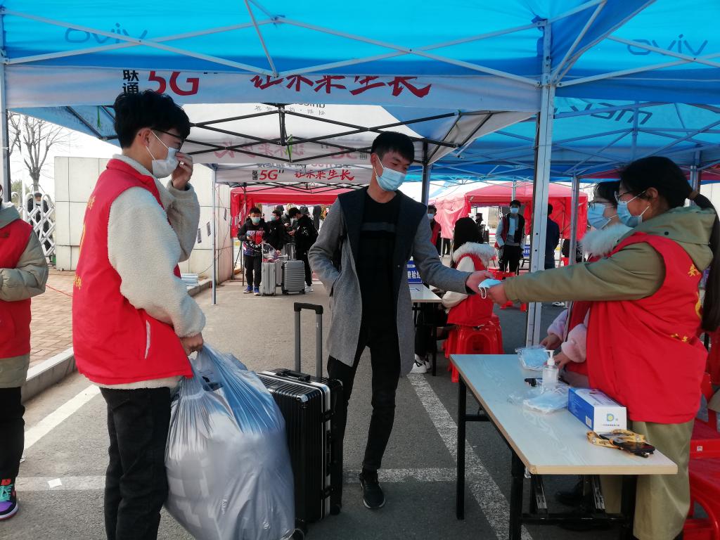 学工队伍、研工队伍、保卫处、后勤保障处、校医院等部门的工作人员在南门入校通道迎接学生归来,按照“应检尽检、不漏一人”的原则,执行体温检测、健康码核验、返校码核验、核酸检测阴性证明核验、口罩更换等入校程序。学生志愿者们协助开展入校核验程序,帮助同学们提行李、引导学生入校。