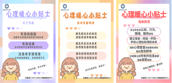 5月25日至30日,学校组织专兼职辅导员和心理健康教师参加了全国高校思政队伍心理健康教育培训。5月16日举办了辅导员心理健康主题班会设计方案大赛,通过培训和比赛,督促辅导员思考并实践心理健康教育工作,提升心理健康教育工作能力。在具体工作指导上,学校大学生心理健康教育中心针对学生共性问题制作了一批心理健康暖心贴士,提供给本校学工干部队伍,指导他们更好地服务学生。暖心贴士从有效沟通、应对负面情绪、应对情绪失控、危机防范等几个方面以图文并茂的形式给出具体的工作方法,使学工干部队伍的工作更专业有效。