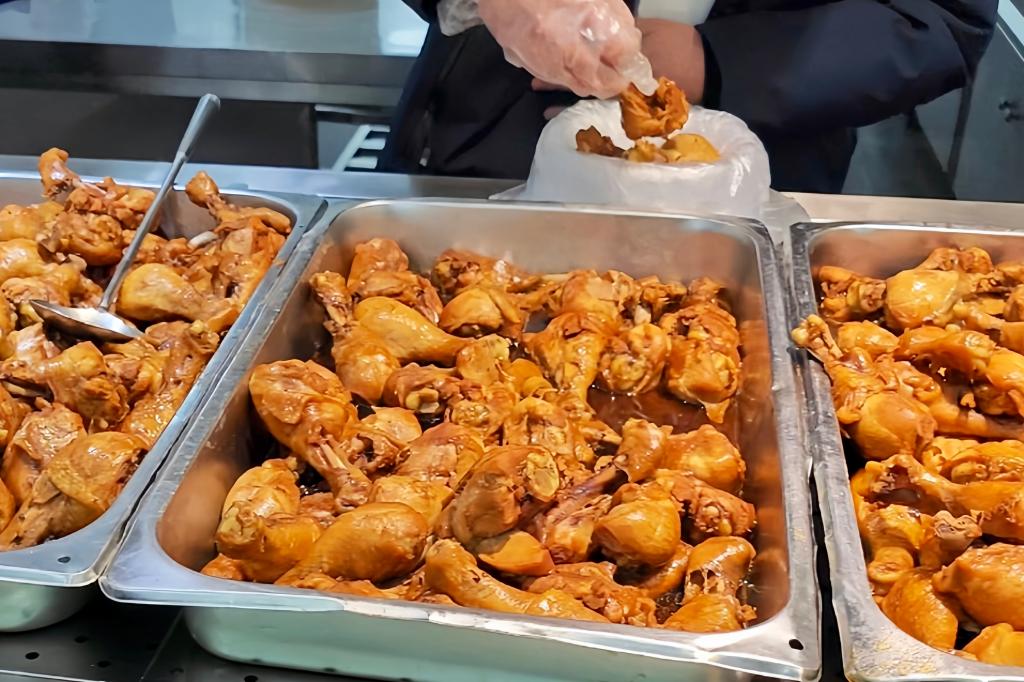 总务部为学生发放鸡腿和橙子(摄影:王冰洁)