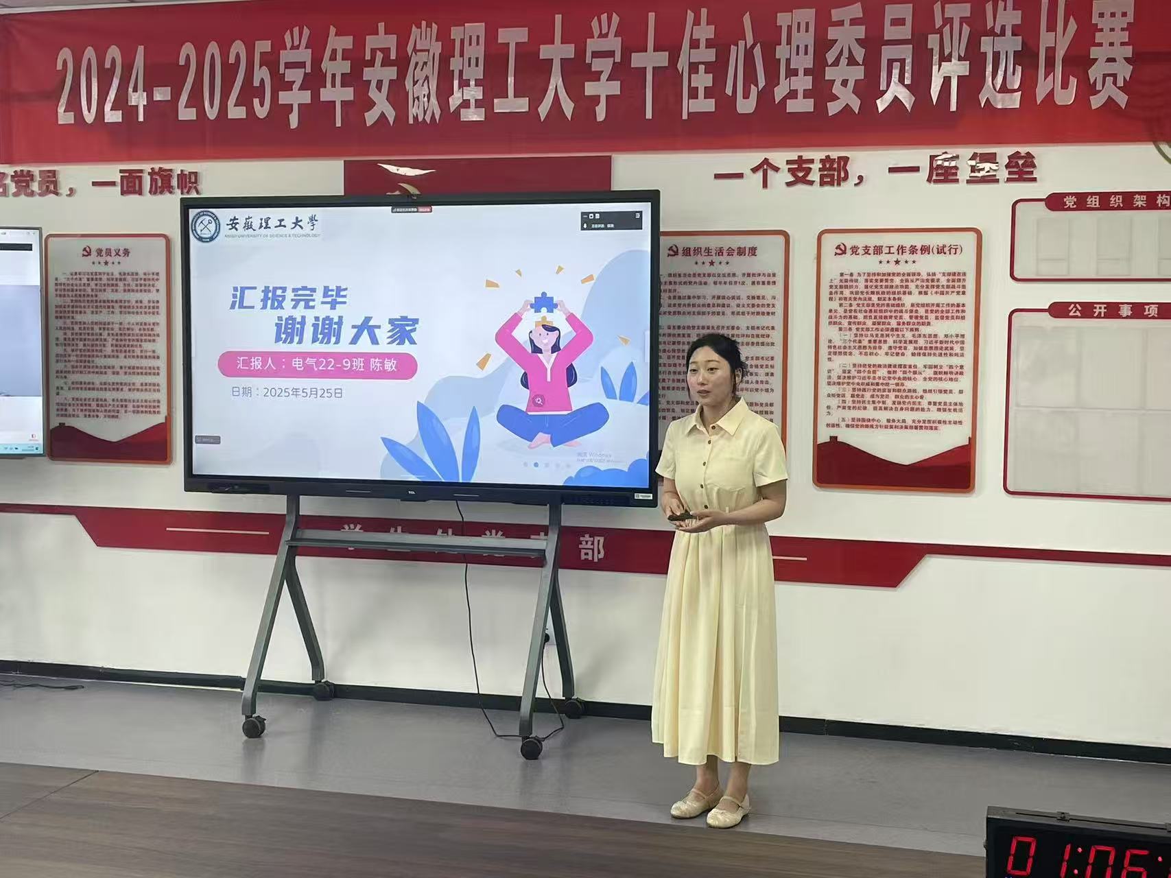 答辩现场,心理委员们从初心感悟、工作经验、心灵成长等方面进行工作成果展示,并回答评委的提问。来自电气与信息工程学院的陈敏同学还原了如何通过日常观察发现同学的心理异常并联动辅导员、心理中心及时帮扶的真实案例;机电工程学院陈新宇同学示范了如何将趣味心理拓展游戏引入心理班会来实现班级同学温暖互动的案例;材料科学与工程学院尹素蕊同学介绍了校院班寝四级心理工作网络中心理委员的工作实践。