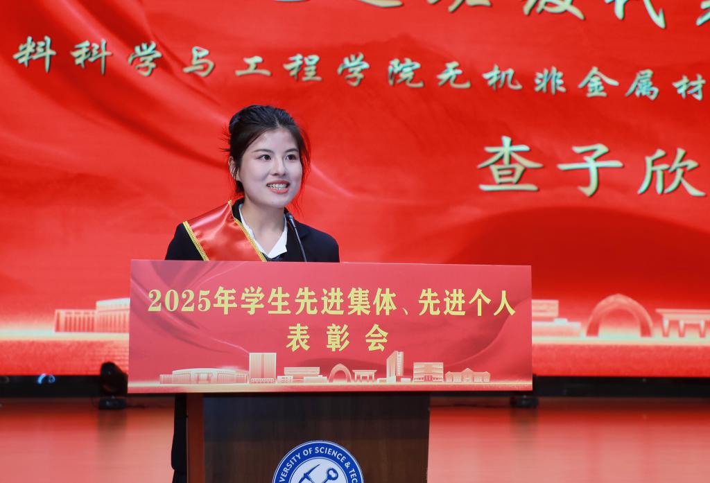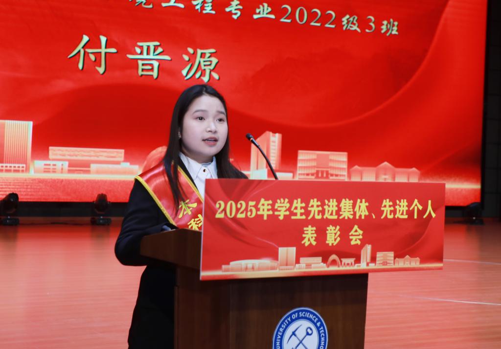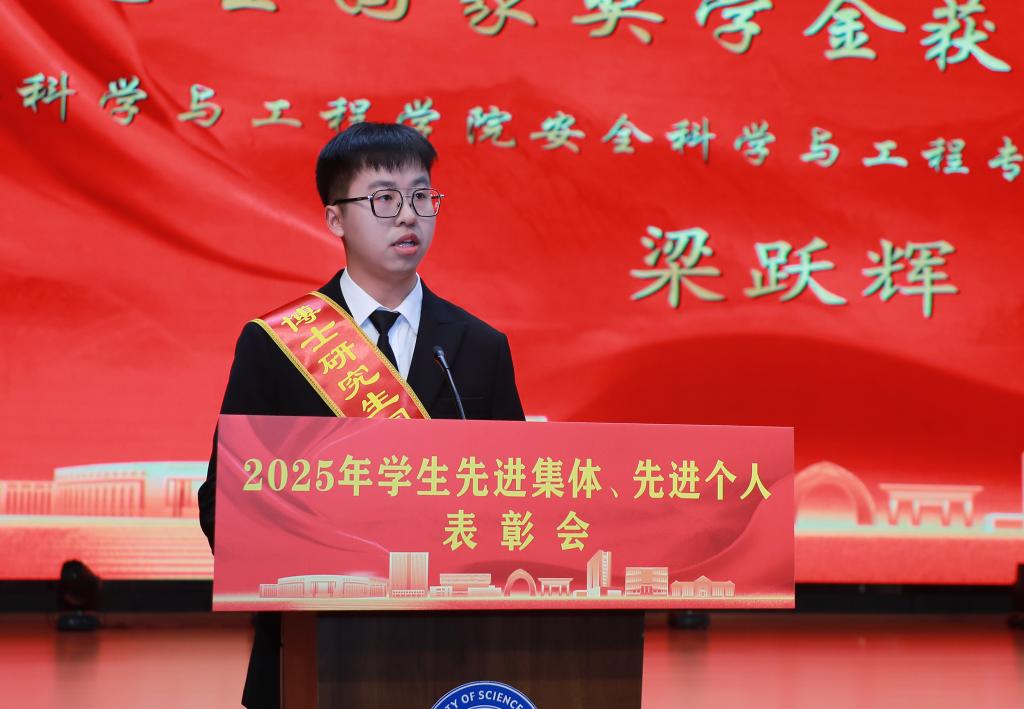 先进班级代表、材料科学与工程学院无机非金属材料工程2022级1班查子欣,三好学生标兵代表、力学与光电物理学院工程力学专业2023级1班赵志东,本科生国家奖学金获得者代表、地球与环境学院环境工程专业2022级3班付晋源,研究生国家奖学金获得者代表、安全科学与工程学院安全科学与工程专业2024级博士研究生梁跃辉分别在会上作了交流发言。