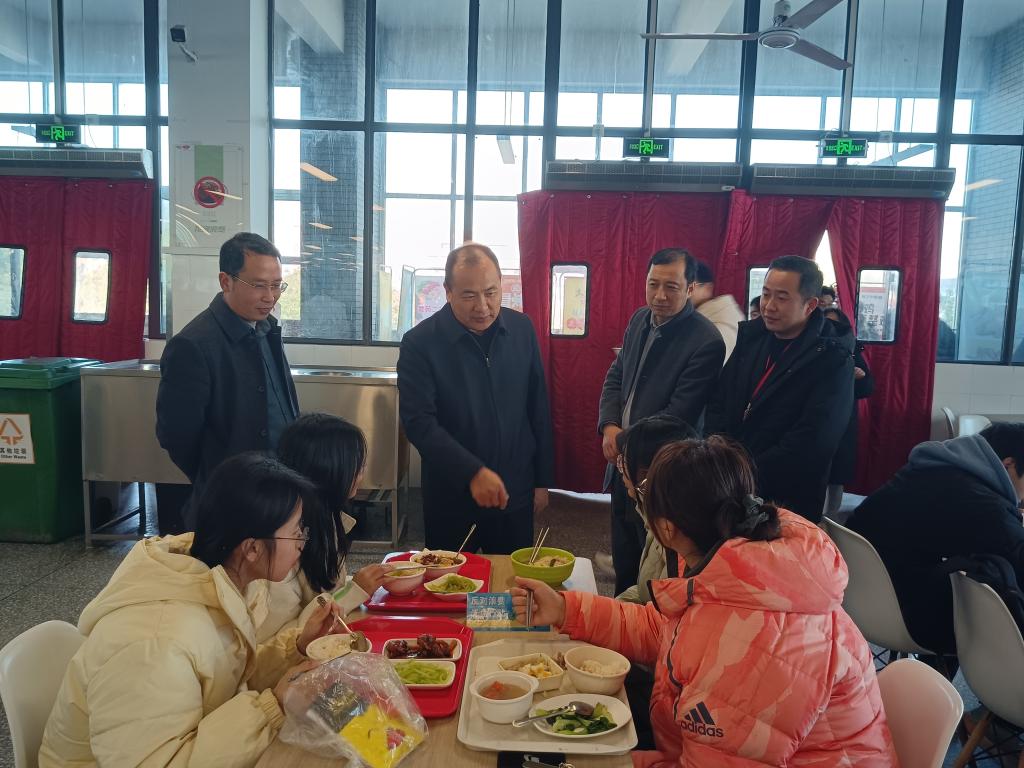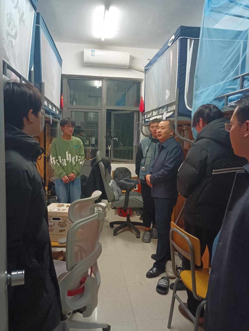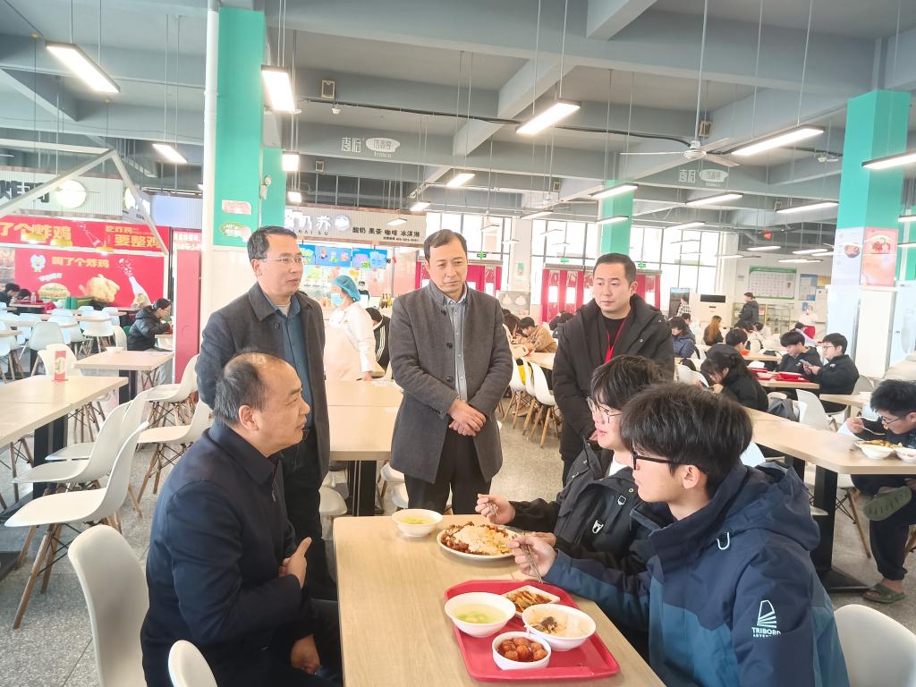 调研中,王先江格外关注学生日常生活保障,在各宿舍区食堂与就餐学生共叙生活、就业、建议等问题。走进学生宿舍,他重点检查消防安全设施配备与使用情况,叮嘱同学们强化安全防范意识;同时与期末复习的同学亲切攀谈,关切询问复习进度、学业难点,鼓励大家积极备考,并围绕生涯规划、就业方向等热点问题分享经验、答疑解惑,为学生们成长和就业支招。