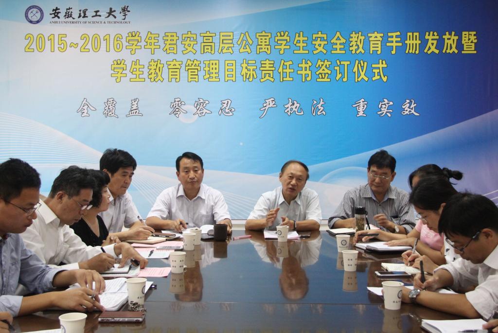 2015年9月23日,学校在大学生素质教育中心会议室召开了君安高层公寓学生教育管理工作会议,部署新学期君安高层公寓学生安全教育管理工作,发放了《学生安全教育手册》并与新入住高层公寓学生辅导员签订了《学生教育管理目标责任书》。副校长叶醒狮出席会议并讲话。学生处处长田中良主持会议。