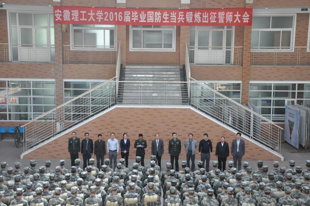 4月18日上午,安徽理工大学2016届132名毕业国防生当兵锻炼出征誓师大会在大学生活动中心举行。副校长叶醒狮出席大会并讲话,中国人民解放军驻校选培办辛崇波主任、彭先俊大校,学校相关职能部门、相关学院领导参加了大会,大会由学生处处长田中良主持。