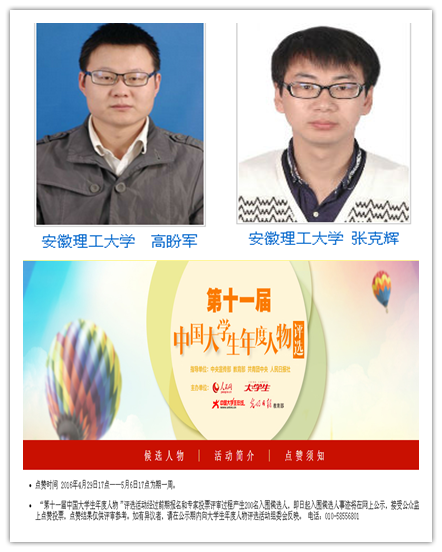 4月29日,经前期报名和专家投票评审,“第十一届中国大学生年度人物评选”活动共产生200名入围候选人(公示)。我校推荐的土木工程专业本科生张克辉和安全工程专业研究生高盼军两位同学均入围。