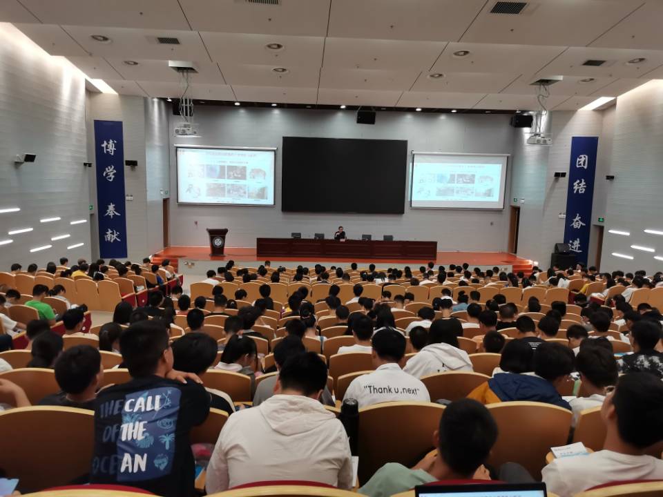 地球与环境学院全体新生在舜耕会堂主会场听课,其他新生在教室通过观看直播的方式进行了同步学习。