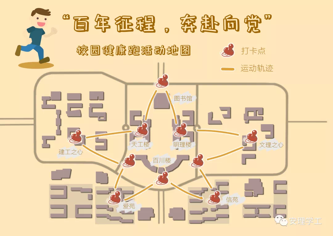 本活动将党史学习、校史教育和青年担当相结合,以党的百年发展史为时间主线,环绕校园设置了五角星形跑步路线,象征着重走党的百年风雨之路,展望未来伟大复兴的青年抱负。路线以厚德馆为起点,途径百川大楼、天工教学楼、明理教学楼、至善书院等学校主要建筑,3700多米的路线象征着从中国共产党建立到新中国成立期间,牺牲的370多万有名可查的共产党员。