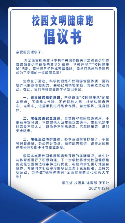 由学生处牵头,联合校团委、保卫处、体育部等多部门,通过“辅导猫”平台向全校学生发布《校园文明健康跑倡议书》,从树立诚信规矩意识、增强交通安全意识、增强运动防护意识等方面发出倡议,希望广大学子自觉遵守校园交通秩序,诚实守信,不请他人代跑、不代替他人跑,坚决杜绝骑自行车或者电动车摇手机代替人工跑步。