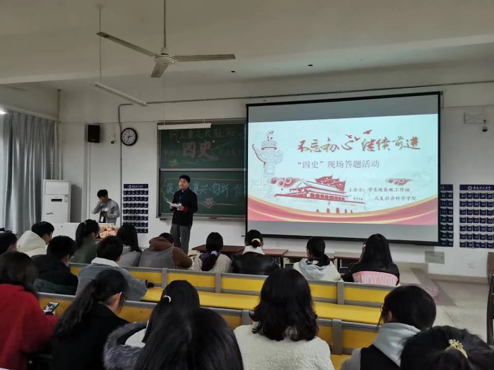 11月21日下午,校易班发展中心联合人文社会科学学院在天工南314举办“学习四史文化,传承时代精神”知识竞赛,来自人文社会科学学院的6支学生参赛队伍展开了精彩比拼,为观众带来了一场精彩绝伦的知识盛宴。