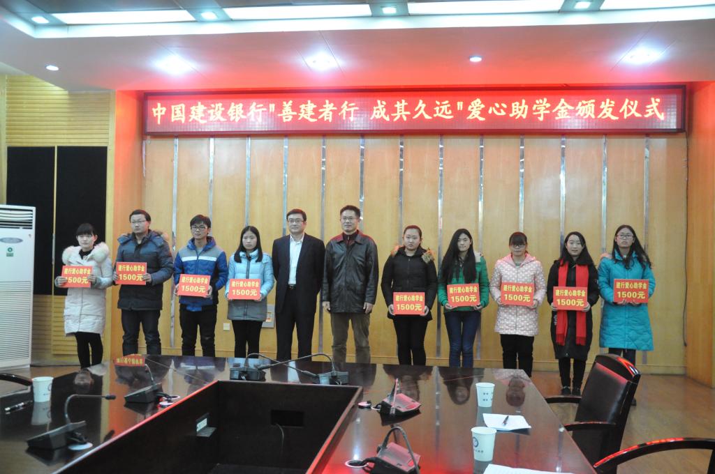 1月5日下午,中国建设银行“善建者行 成其久远”爱心助学金颁发仪式在本部图书馆一楼会议室隆重举行,校纪委书记周峰、建行淮南市分行副行长张松茂出席仪式并共同为受助学生颁发爱心助学金。仪式由学生处处长田中良主持。