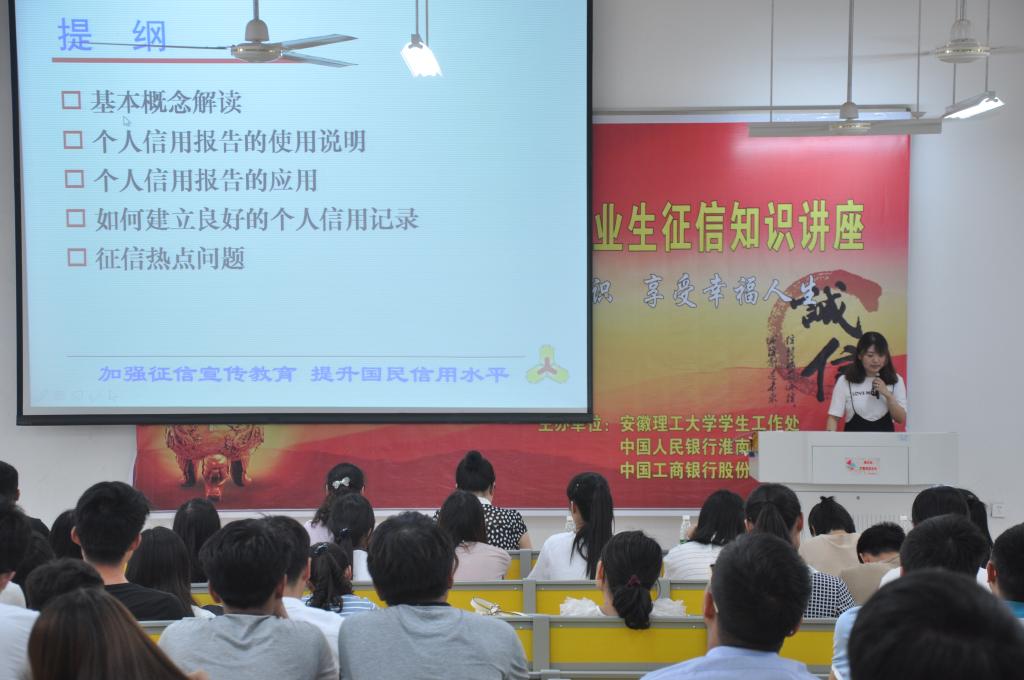 随着中国人民银行个人信用基础数据库的不断完善,全国联网查询的实现,《征信业管理条例》的颁布,我国已经步入信用新时代。对大学生而言,特别是生源地信用助学贷款的广泛开展,国家助学贷款已经成为解决家庭经济困难学生缴纳学费的主要途径,学生个人是否履行承诺,按约还款等已经成为制约个人经济行为、个人发展的重要因素,也越来越多地受到学生、家长、学校以及社会的关注。此次活动由安徽理工大学与中国人民银行淮南市中心支行、中国工商银行淮南洞山支行共同主办,讲座是我校学生诚信教育主题月系列活动之一,是继诚信教育主题班会、诚信我先行签名活动、观看诚信教育宣传片等系列活动之后,加强大学生诚信教育的又一重要举措。活动的顺利开展,不仅促进了广大同学对个人信用关注度的提高,普及了征信知识,提高了学生的诚信意识,而且使广大同学认识到了诚实守信的重要意义,受到广大毕业生的欢迎与好评。