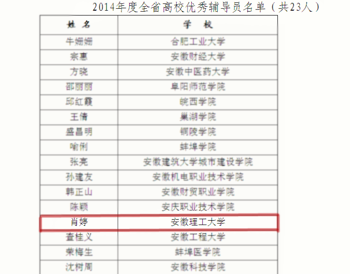 根据《中共安徽省委教育工委转发教育部思想政治工作司关于举办第七届全国高校辅导员年度人物评选活动的通知》(皖教工委函〔2015〕31号),近期,安徽省组织开展了第七届全国高校辅导员年度人物以及2014年度全省高校辅导员年度人物和优秀辅导员评选工作。经专家评选,共评选出 “2014年度全省高校辅导员年度人物” 10名,“2014年度全省高校优秀辅导员” 23名。我校外国语学院肖婷老师荣获“2014年度全省高校优秀辅导员”称号。