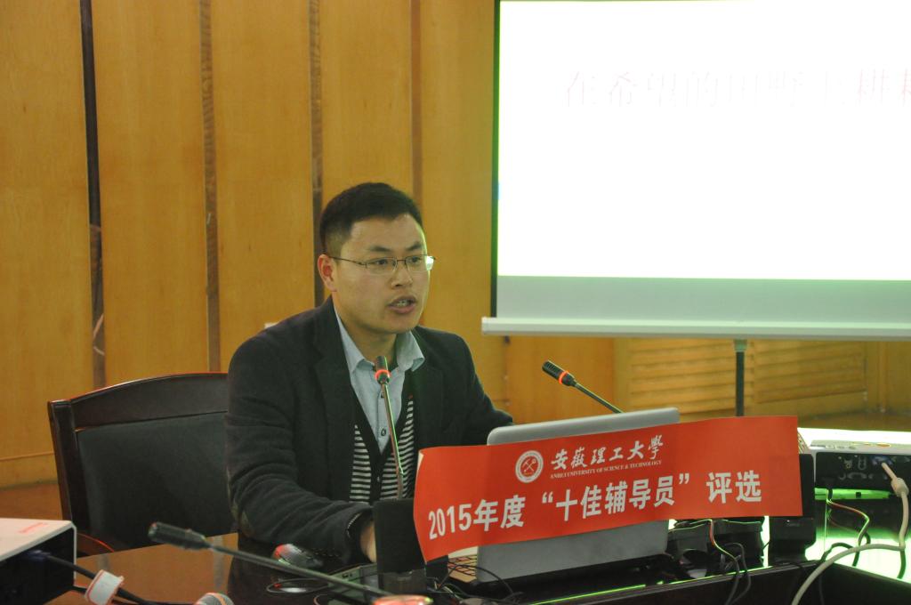 经个人自评和学院初评推荐,共有16位辅导员老师参加校“十佳辅导员”评选,学校根据公开、公平、公正原则,组织专家进行网络评审和现场考评,共评出任少伟、李洁、赵埕萱、杨志华、李攻明、吕金梅、张娜、宫盼盼、张坤、邵飞等10位老师为2015年度安徽理工大学“十佳辅导员”。