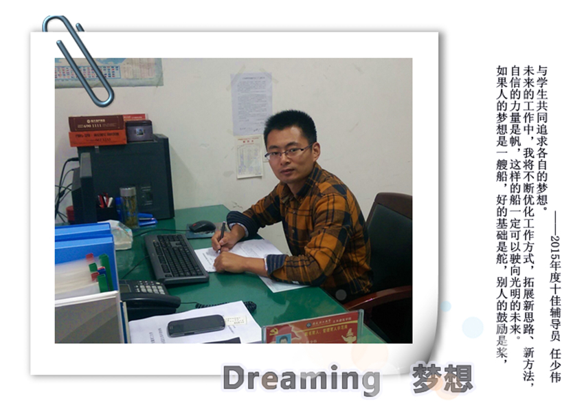 如果人的梦想是一艘船,好的基础是舵,别人的鼓励是桨,自信的力量是帆,这样的船一定可以驶向光明的未来。作为辅导员,我对学生说的最多的一句话是“人一定要有梦想!”作为学生的指导者、引路人和知心朋友,我不断提醒自己要做到全心投入,正确引导,传递真情,助力成长。我自己也在努力奋斗,不断进取,给学生做榜样。未来的工作中,我将不断优化工作方式,拓展新思路、新方法,与学生共同追求我们的梦想。