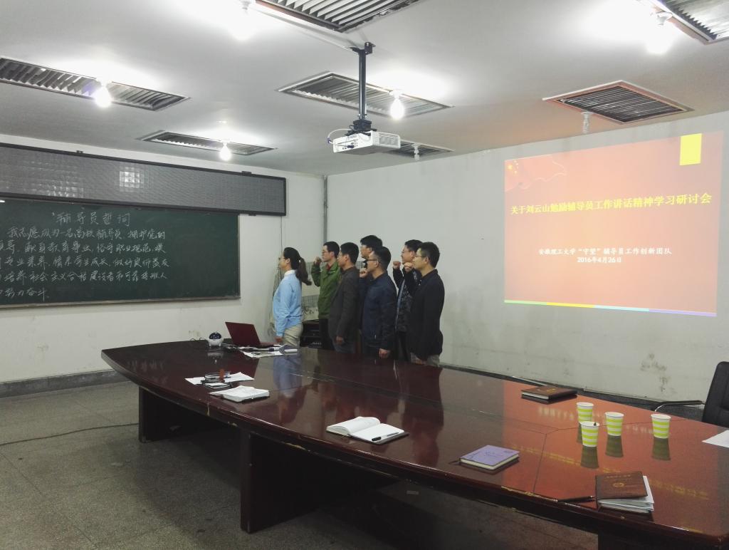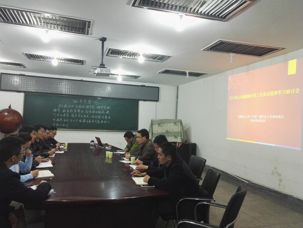 4月26日,安徽理工大学“守望”辅导员工作创新团队在电气与信息工程学院三楼会议室举办关于刘云山同志勉励辅导员工作讲话精神的学习研讨会,学生处副处长涂有胜,电信学院党委副书记徐关怀,“守望”团队全体成员和电信学院辅导员代表参加了此次会议。
