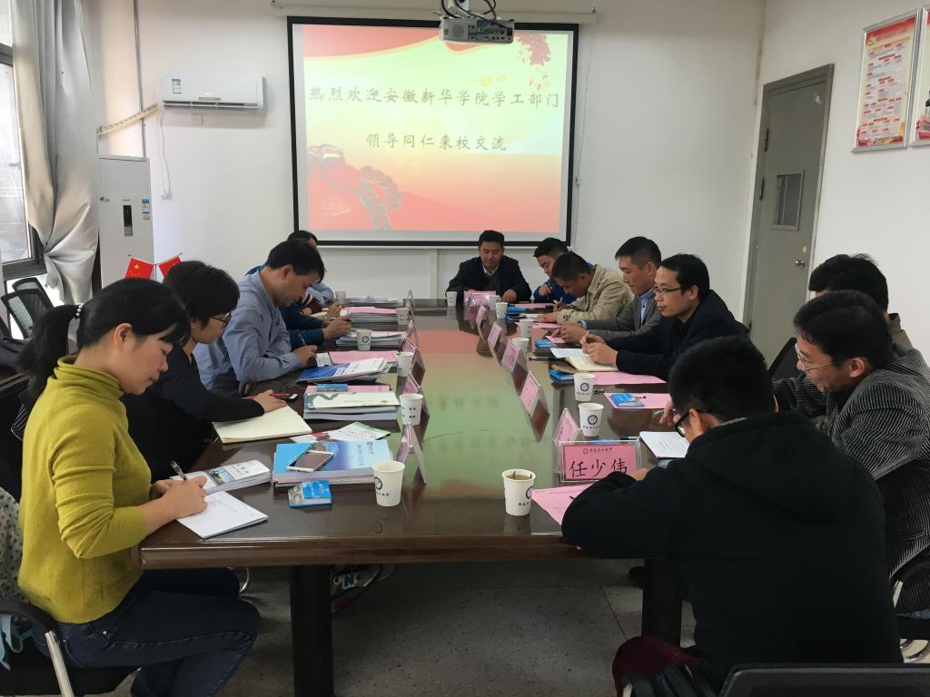 11月2日下午,安徽新华学院学生处处长、校团委书记汪俊东和财会与金融学院院长助理窦梅朋等一行6人,在我校厚德馆4楼学生处会议室,就学生教育管理服务工作,与我校学工部门工作人员进行交流研讨。党委学工部副部长、学生处副处长涂有胜主持会议。