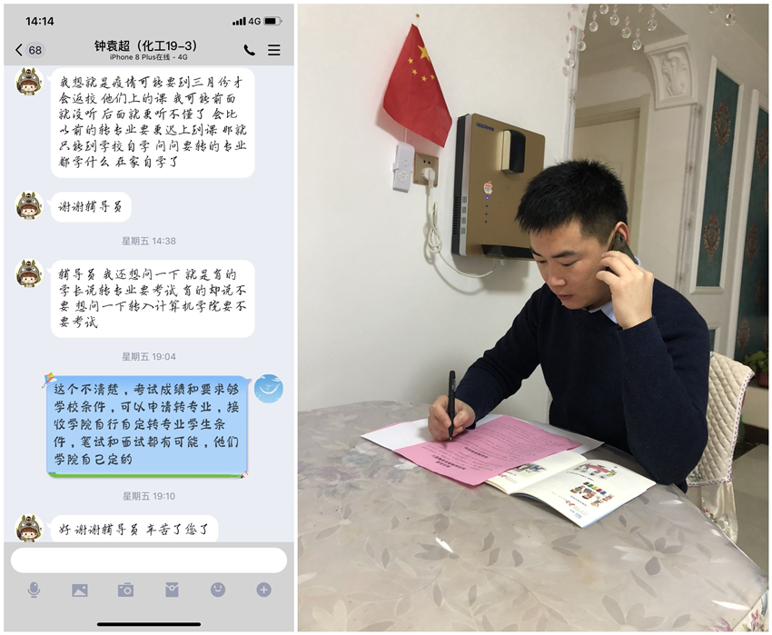 化学工程学院周昌贵老师针对同学们普遍关心的“网课”、“转专业”、“重修选课”等问题,一一进行在线解答。面对即将到来的学期,督促同学们在线制定新学期学习计划,帮助学生充实“宅时光”。确保同学们保持稳定学习节奏,停课不停学。计算机科学与工程学院崔文豪老师积极联系基础课教师,为学生及时发布任课老师提供的线上教学材料ppt,并协助基础课教师做好线上教学准备工作。