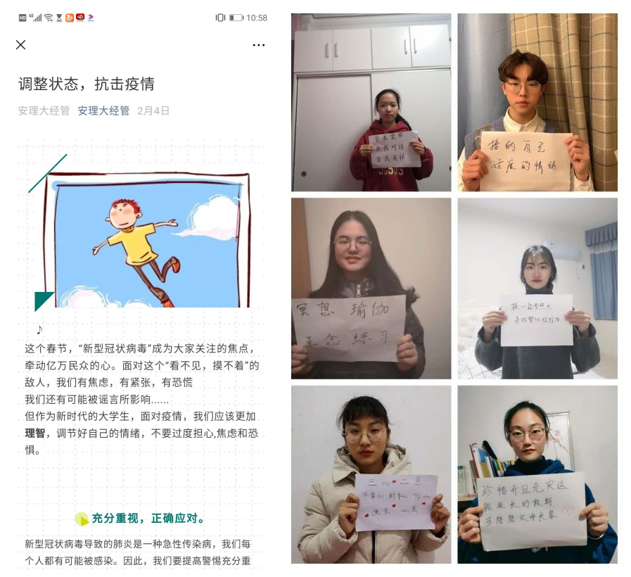 这个寒假,经济与管理学院的李双双老师比平时更忙了,一方面,作为辅导员,李双双迅速建立联动网络化管理反馈机制,每日进行全年级494名学生的健康报送;另一方面,作为专业的心理学科班出身的人,他深知当前紧迫的疫情防控工作形势下,同学们可能产生的焦虑与困扰,他及时关注学生思想状态,开展“网上谈心谈话”,传达防疫工作要求部署,进行科普宣传和心理教育,确保谈心谈话覆盖到每一位学生。通过QQ,微信发布《关于面向全校师生开通心理支持热线及网络辅导服务的公告》、《理性“看”疫,坚定“抗”疫—安徽理工大学师生心理支持手册》、《应对新型冠状病毒肺炎疫情心理调适指南》,强化学生积极心理。编写《调整状态,抗击疫情》,教育引导学生提高对疫情的正确认知,建立积极正向思维和行为,学会缓解焦虑、恐惧情绪等,学会隔离信息,引导不要过度关注疫情信息、注意身心和谐。同时他还发挥专长优势,通过不同方式,为社会上有需求的人们提供免费咨询服务和心理援助,宣讲防控知识,开展心理危机干预和精神慰藉,疏导情绪,减压降负,引导人们坚定信心,培树健康心态,为全民众志成城抗疫情贡献力量。
