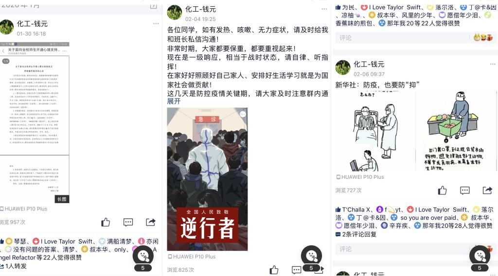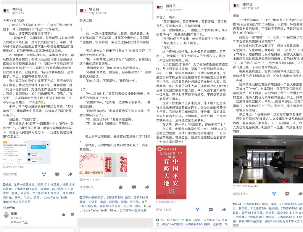 从了解学生信息,掌握学生情况,到分享防控知识,都铭记着辅导员们的责任与担当。化学工程学院钱元老师每天都会在各个班级群里,关注学生的思想动态,鼓励学生用乐观的心态积极面对生活。钱老师先后利用QQ空间说说发布防控疫情、心理调适、加强寒假规划等几十条说说,向学生展示了中国人民面对疫情时体现出的众志成城,不畏艰险、牺牲奉献的伟大精神,给学生传递出满满的正能量。
