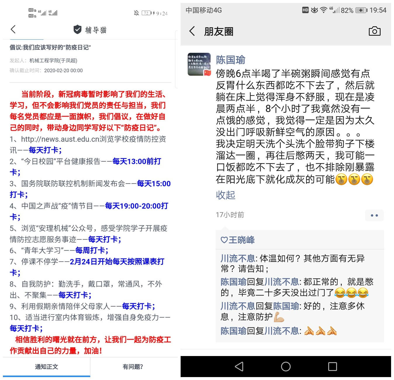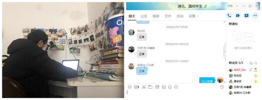 1月31日晚,正在江苏与家人共度春节的外国语学院辅导员秦镇老师在接到学院党委书记的一个电话后,第二天一早就回到安徽淮南。他在返程途中迅速创建了学院疫情防控工作组微信群,并邀请班干部加入了学院--班级两级“战疫情”联防联控微信群。他克服各种不便和困难,确保所带的208名本科生22名研究生全部按照学校部署完成“辅导猫”平台的接入,累计向学生发送重要通知4次、信息采集任务1084人次,召开线上会议3次,线上沟通交流记录数千条,确保做到底数清、情况明。