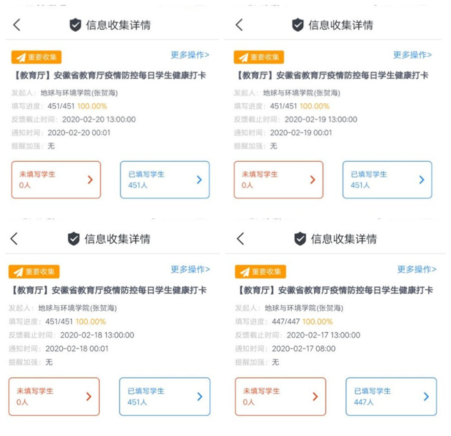 “同学们调整一下自己的寒假作息,每天上午记得做健康打卡。@所有人”,这是地球与环境学院张贺海老师发在学生群里的一条消息。他深知,只有全面了解、精准摸排、跟踪核查才能确保向学校准确及时上报信息。他每天询问疫情比较严重的湖北、温州地区的学生的生活状况,跟踪发热、咳嗽等身体不适学生的身体情况,督促同学们健康打卡。自安徽省教育厅要求采集学生健康信息以来,张老师所带的447名学生每日打卡率均为100%。每日“健康签到”已经成为我校学生寒假里一种特殊生活方式。