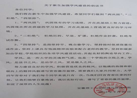强化听课制度,每天都会有学院领导、系主任或者辅导员去班级听课,要求教师必须对学生进行点名考勤,考勤记录要送到学院教学秘书处。向学生发出倡议书,要求做到“两巩固”、“三杜绝”、“四坚持”。巩固现有的学习成绩,并在此基础上努力前进;巩固现在所在班级的学习氛围,并在此基础上营造更良好的学习环境。杜绝迟到、早退、旷课;杜绝作业抄袭;杜绝考试作弊。坚持早、晚自习;坚持按时保质保量完成作业;坚持上课具有饱满精神面貌来配合老师的教学;坚持积极参加由学校、学院组织的各项学风建设活动。