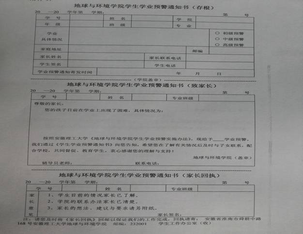 地球与环境学院学生学业预警通知书