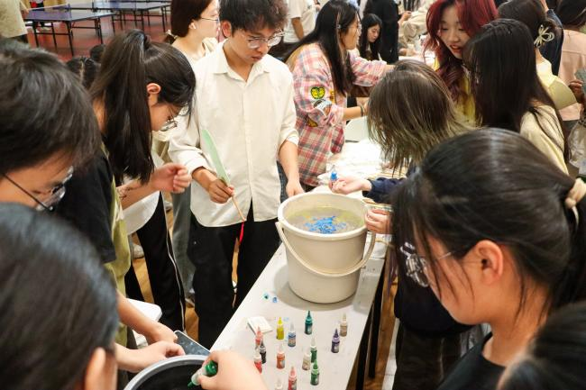 在“画情绪怪兽”活动区,同学们将内心的烦恼、伤心、生气等负面情绪写在气球上,随着气球的破裂,压力也随之消散,现场欢声笑语不断。非遗疗愈活动则带领大家走进淮小虎传统非遗作品的世界,从上色到装饰,每一笔都倾注着专注,让同学们在慢工细作中释放压力,感受着“匠人精神”的滋养。手工漆扇DIY活动中,同学们发挥创意,经过“漆”入水、划“漆”成纹、浸扇上“漆”等步骤,制作出独一无二的漆扇,在创作中收获生活的小确幸。